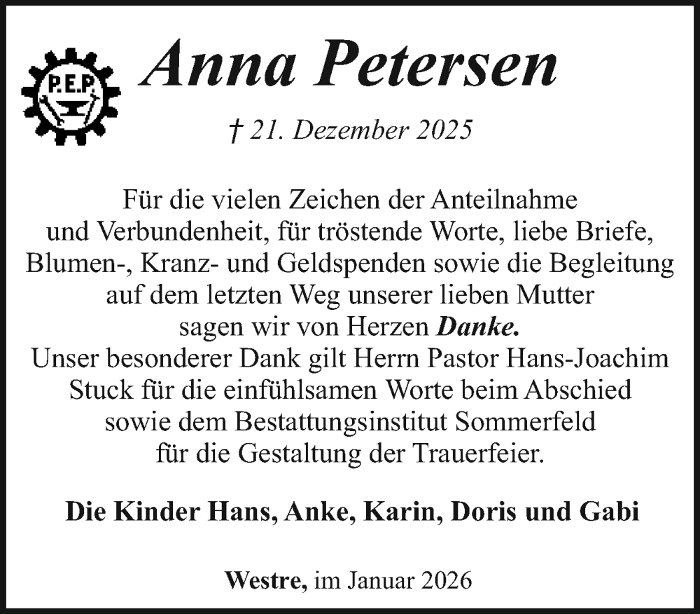 Hier finden Sie alle Traueranzeigen aus der Zeitung, die bisher für Anna Petersen erschienen sind. Weitere Traueranzeigen, die in der Zeitung erscheinen, werden hier ebenfalls aufgelistet