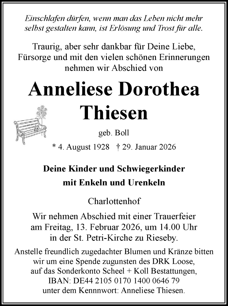 Hier finden Sie alle Traueranzeigen aus der Zeitung, die bisher für Anneliese Dorothea Thiesen erschienen sind. Weitere Traueranzeigen, die in der Zeitung erscheinen, werden hier ebenfalls aufgelistet