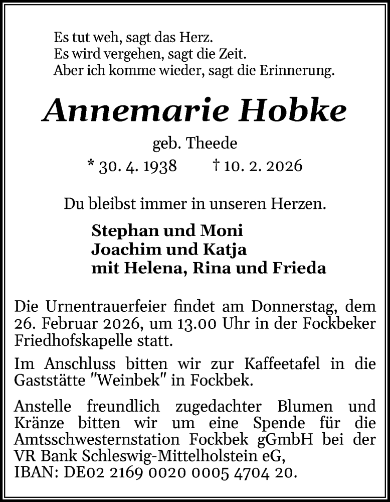 Hier finden Sie alle Traueranzeigen aus der Zeitung, die bisher für Annemarie Hobke erschienen sind. Weitere Traueranzeigen, die in der Zeitung erscheinen, werden hier ebenfalls aufgelistet
