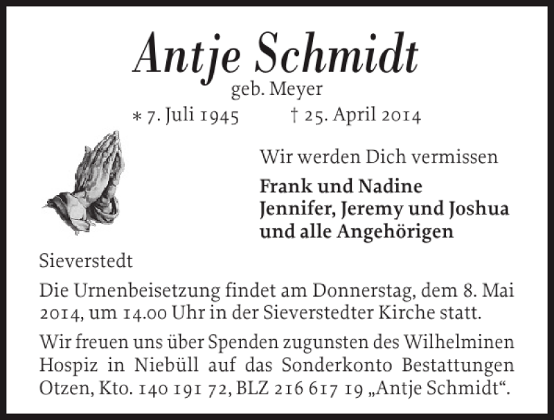 Hier finden Sie alle Traueranzeigen aus der Zeitung, die bisher für Antje Schmidt erschienen sind. Weitere Traueranzeigen, die in der Zeitung erscheinen, werden hier ebenfalls aufgelistet