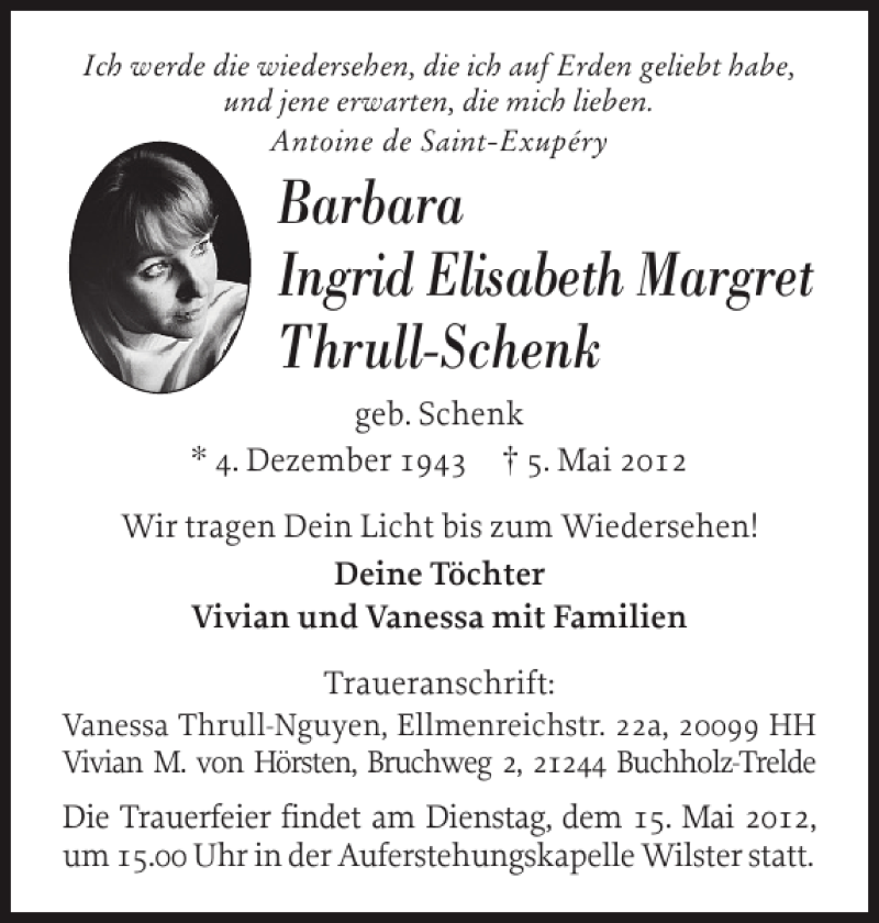 Hier finden Sie alle Traueranzeigen aus der Zeitung, die bisher für Barbara Ingrid Elisabeth Margret Thrull-Schenk erschienen sind. Weitere Traueranzeigen, die in der Zeitung erscheinen, werden hier ebenfalls aufgelistet
