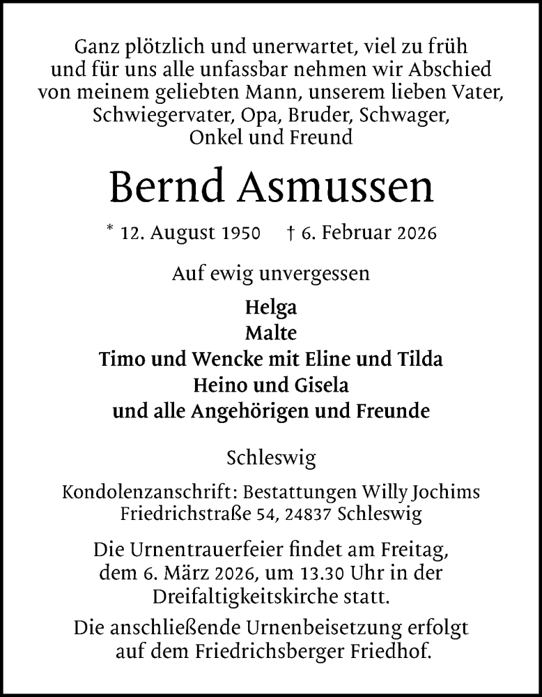 Hier finden Sie alle Traueranzeigen aus der Zeitung, die bisher für Bernd Asmussen erschienen sind. Weitere Traueranzeigen, die in der Zeitung erscheinen, werden hier ebenfalls aufgelistet