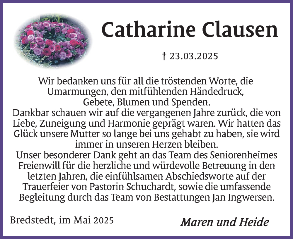Hier finden Sie alle Traueranzeigen aus der Zeitung, die bisher für Catharine Clausen erschienen sind. Weitere Traueranzeigen, die in der Zeitung erscheinen, werden hier ebenfalls aufgelistet