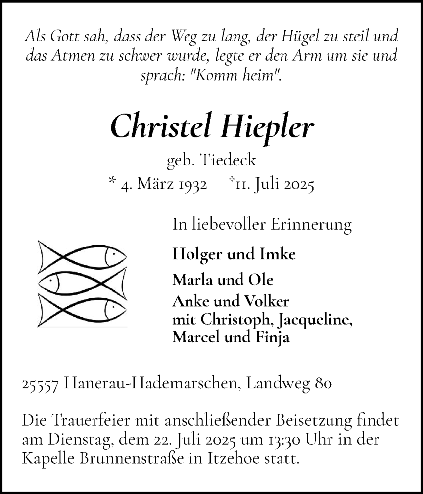 Hier finden Sie alle Traueranzeigen aus der Zeitung, die bisher für Christel Hiepler erschienen sind. Weitere Traueranzeigen, die in der Zeitung erscheinen, werden hier ebenfalls aufgelistet