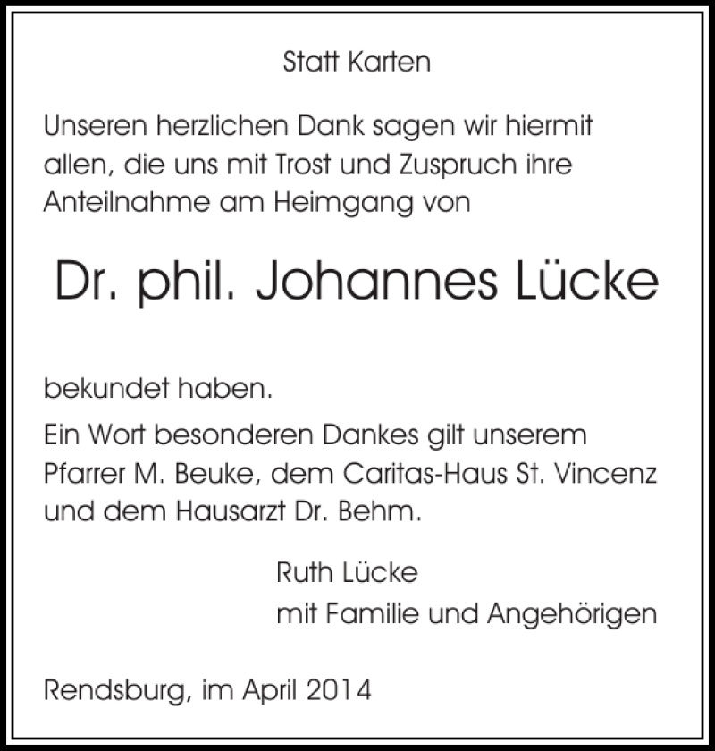 Hier finden Sie alle Traueranzeigen aus der Zeitung, die bisher für Dr. phil. Johannes Lücke erschienen sind. Weitere Traueranzeigen, die in der Zeitung erscheinen, werden hier ebenfalls aufgelistet