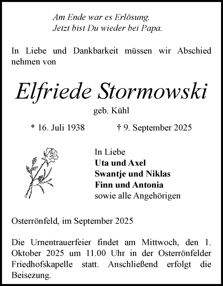 Hier finden Sie alle Traueranzeigen aus der Zeitung, die bisher für Elfriede Stormowski erschienen sind. Weitere Traueranzeigen, die in der Zeitung erscheinen, werden hier ebenfalls aufgelistet