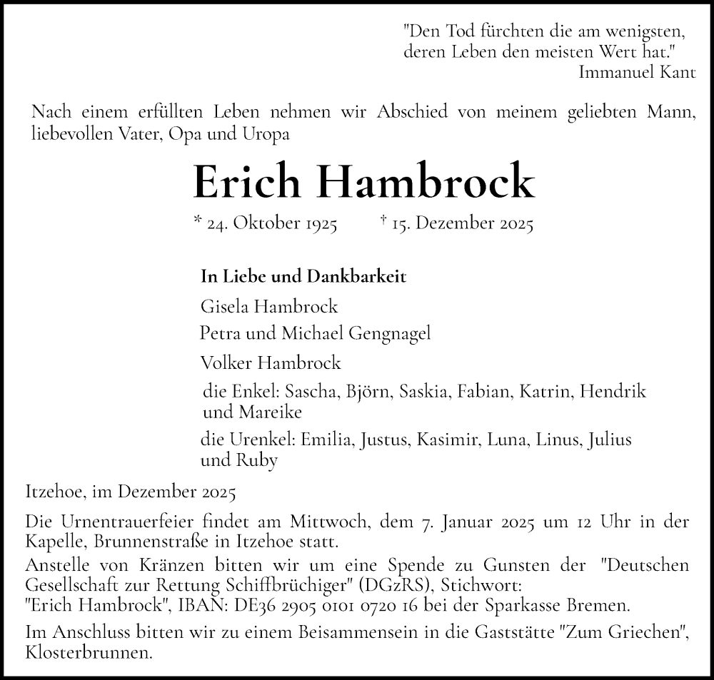 Hier finden Sie alle Traueranzeigen aus der Zeitung, die bisher für Erich Hambrock erschienen sind. Weitere Traueranzeigen, die in der Zeitung erscheinen, werden hier ebenfalls aufgelistet
