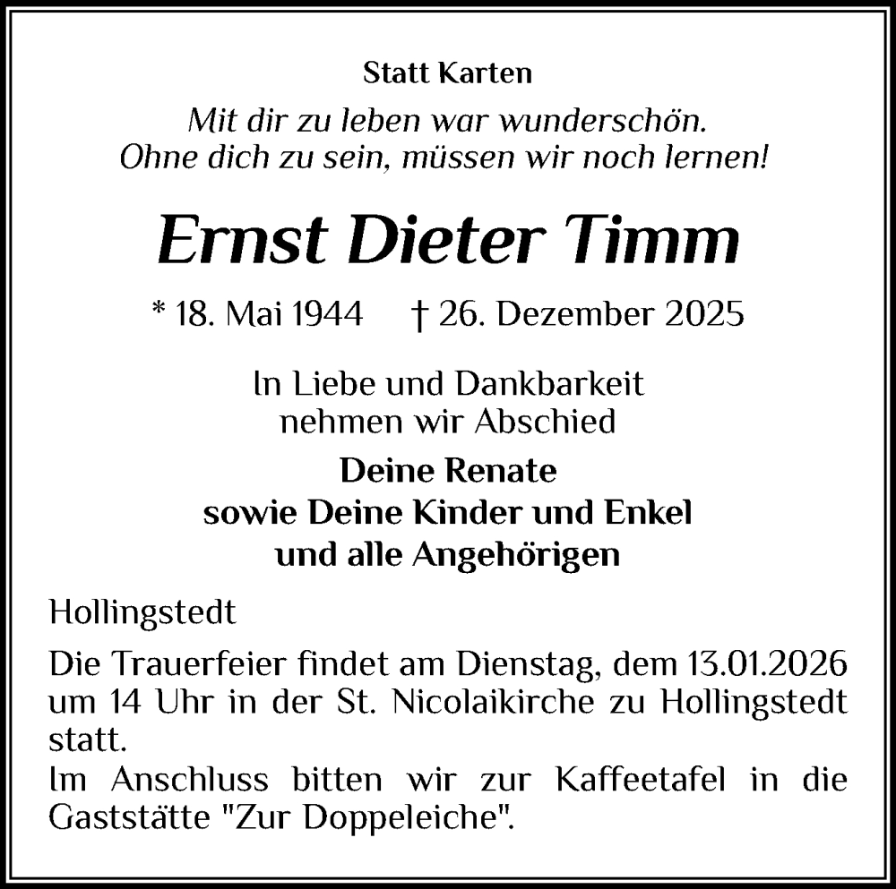 Hier finden Sie alle Traueranzeigen aus der Zeitung, die bisher für Ernst Dieter Timm erschienen sind. Weitere Traueranzeigen, die in der Zeitung erscheinen, werden hier ebenfalls aufgelistet