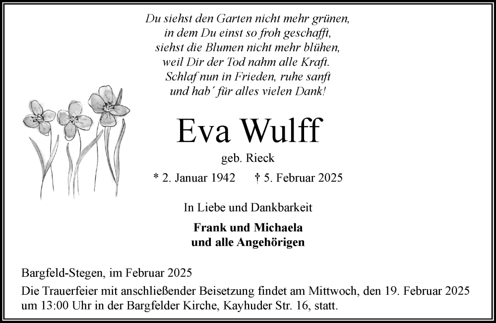 Hier finden Sie alle Traueranzeigen aus der Zeitung, die bisher für Eva Wulff erschienen sind. Weitere Traueranzeigen, die in der Zeitung erscheinen, werden hier ebenfalls aufgelistet