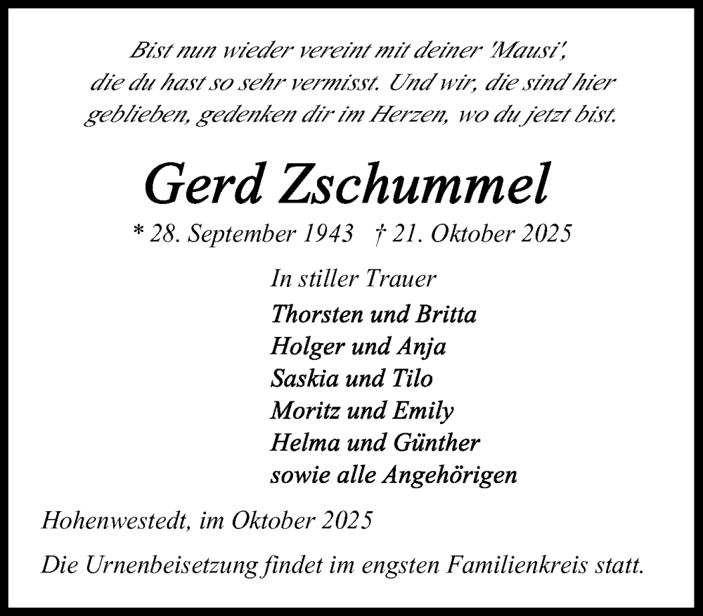 Hier finden Sie alle Traueranzeigen aus der Zeitung, die bisher für Gerd Zschummel erschienen sind. Weitere Traueranzeigen, die in der Zeitung erscheinen, werden hier ebenfalls aufgelistet