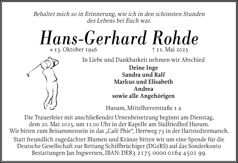 Hier finden Sie alle Traueranzeigen aus der Zeitung, die bisher für Hans-Gerhard Rohde erschienen sind. Weitere Traueranzeigen, die in der Zeitung erscheinen, werden hier ebenfalls aufgelistet