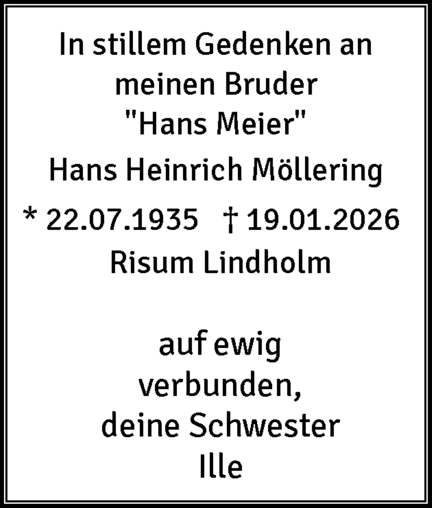 Hier finden Sie alle Traueranzeigen aus der Zeitung, die bisher für Hans Heinrich Möllering erschienen sind. Weitere Traueranzeigen, die in der Zeitung erscheinen, werden hier ebenfalls aufgelistet