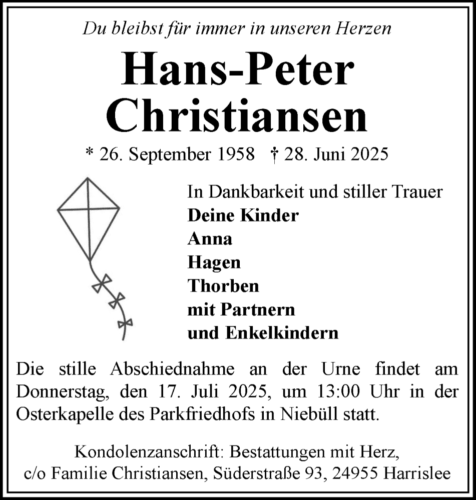Hier finden Sie alle Traueranzeigen aus der Zeitung, die bisher für Hans-Peter Christiansen erschienen sind. Weitere Traueranzeigen, die in der Zeitung erscheinen, werden hier ebenfalls aufgelistet