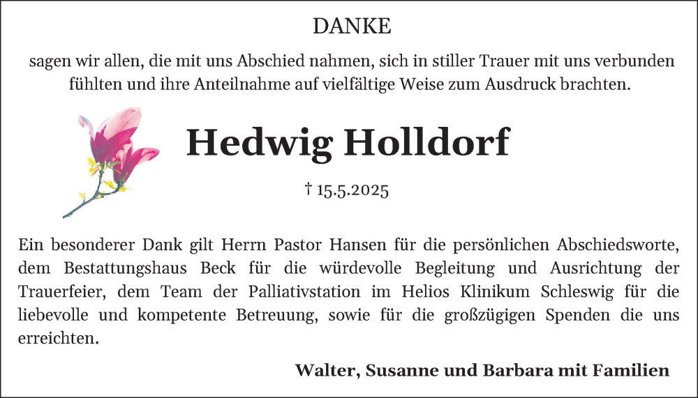 Hier finden Sie alle Traueranzeigen aus der Zeitung, die bisher für Hedwig Holldorf erschienen sind. Weitere Traueranzeigen, die in der Zeitung erscheinen, werden hier ebenfalls aufgelistet