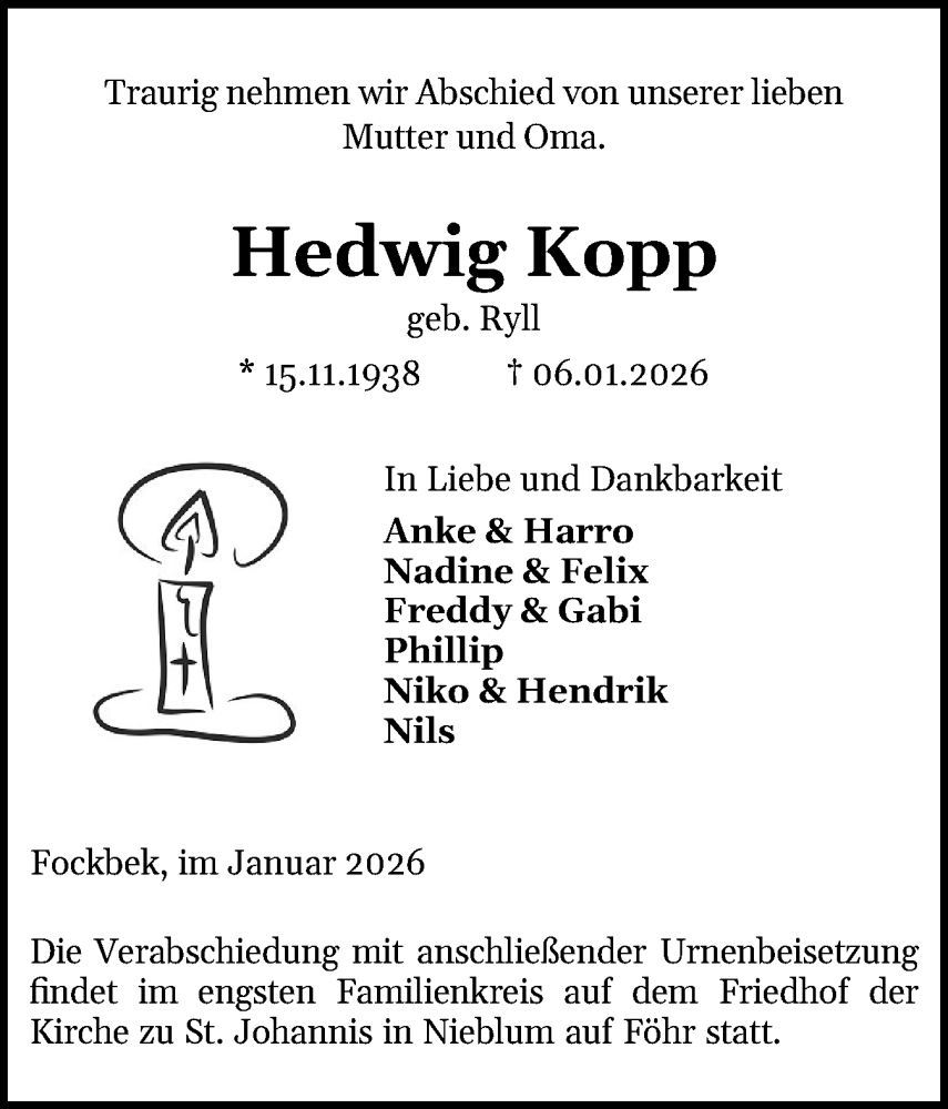 Hier finden Sie alle Traueranzeigen aus der Zeitung, die bisher für Hedwig Kopp erschienen sind. Weitere Traueranzeigen, die in der Zeitung erscheinen, werden hier ebenfalls aufgelistet