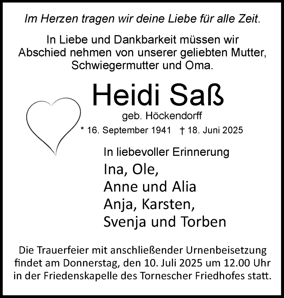 Hier finden Sie alle Traueranzeigen aus der Zeitung, die bisher für Heidi Saß erschienen sind. Weitere Traueranzeigen, die in der Zeitung erscheinen, werden hier ebenfalls aufgelistet