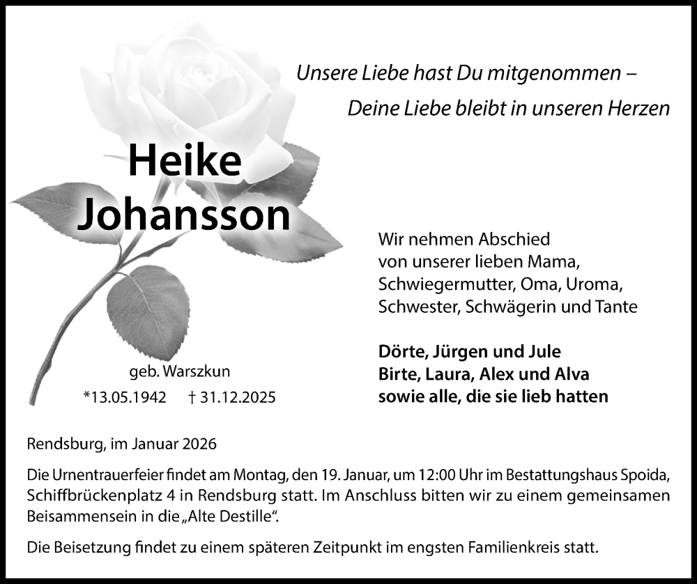 Hier finden Sie alle Traueranzeigen aus der Zeitung, die bisher für Heike Johansson erschienen sind. Weitere Traueranzeigen, die in der Zeitung erscheinen, werden hier ebenfalls aufgelistet