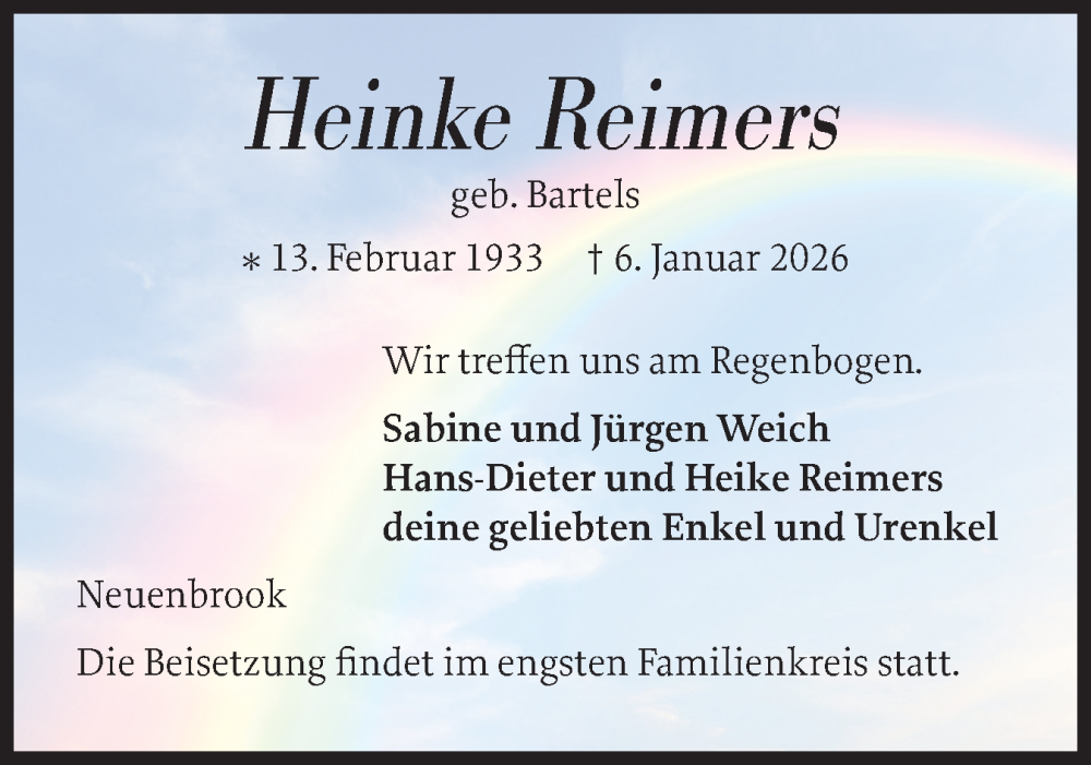 Hier finden Sie alle Traueranzeigen aus der Zeitung, die bisher für Heinke Reimers erschienen sind. Weitere Traueranzeigen, die in der Zeitung erscheinen, werden hier ebenfalls aufgelistet