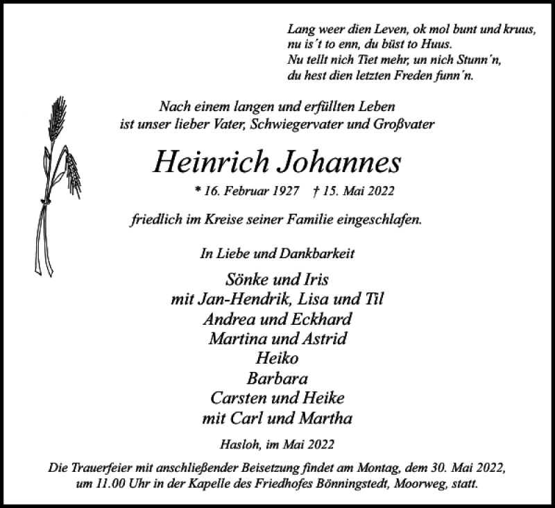 Hier finden Sie alle Traueranzeigen aus der Zeitung, die bisher für Heinrich Johannes erschienen sind. Weitere Traueranzeigen, die in der Zeitung erscheinen, werden hier ebenfalls aufgelistet