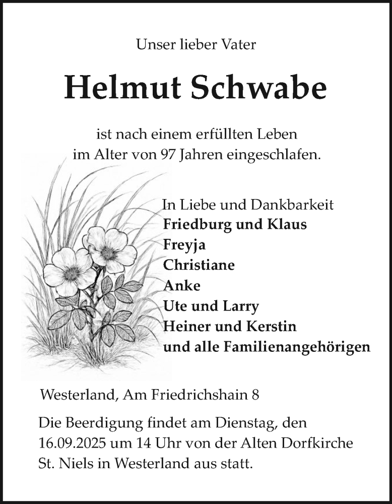 Hier finden Sie alle Traueranzeigen aus der Zeitung, die bisher für Helmut Schwabe erschienen sind. Weitere Traueranzeigen, die in der Zeitung erscheinen, werden hier ebenfalls aufgelistet