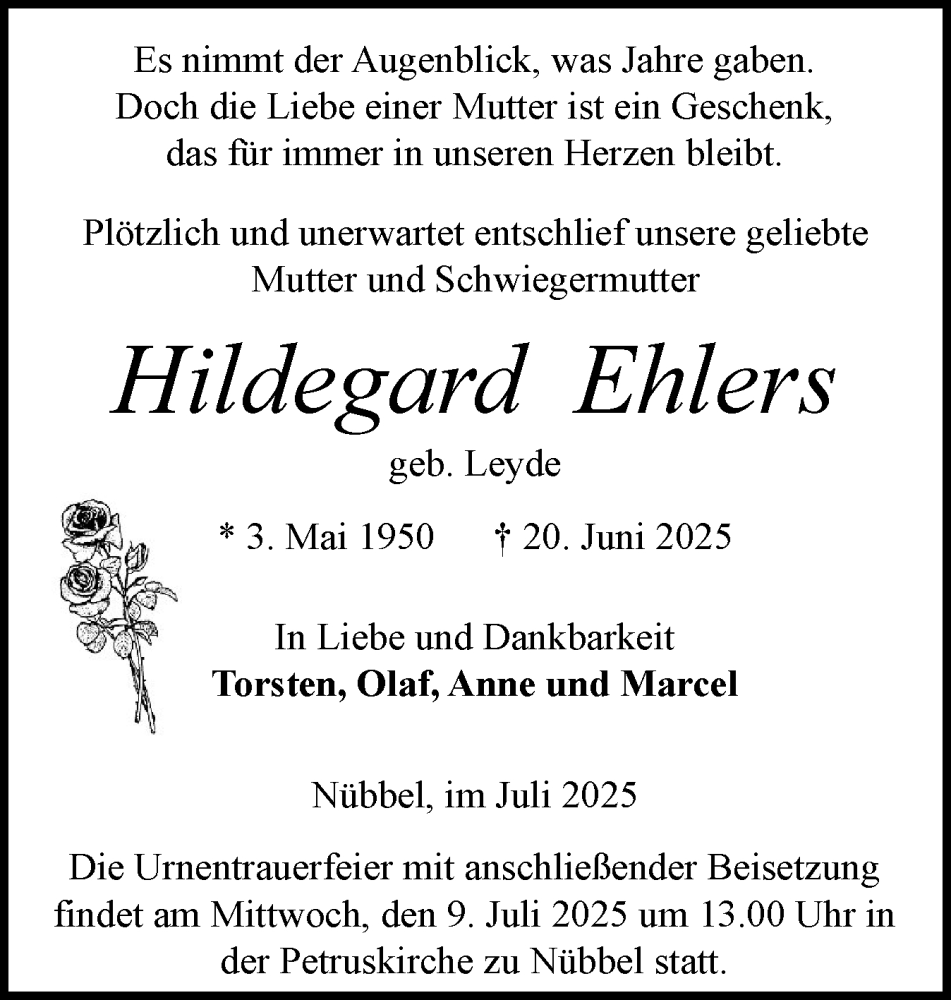 Hier finden Sie alle Traueranzeigen aus der Zeitung, die bisher für Hildegard Ehlers erschienen sind. Weitere Traueranzeigen, die in der Zeitung erscheinen, werden hier ebenfalls aufgelistet