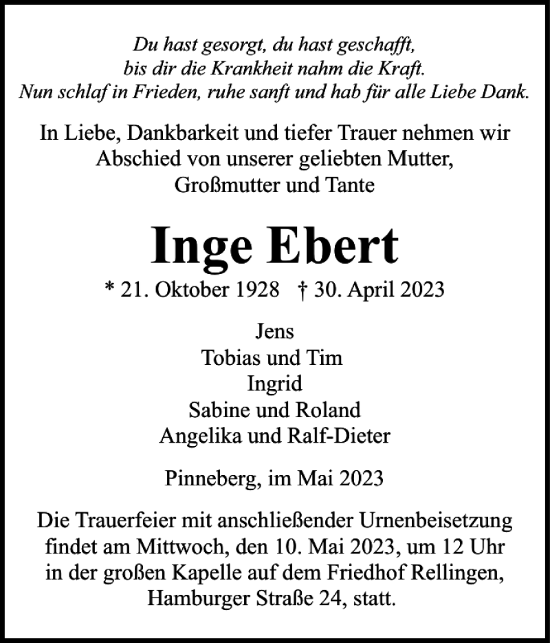 Hier finden Sie alle Traueranzeigen aus der Zeitung, die bisher für Inge Ebert erschienen sind. Weitere Traueranzeigen, die in der Zeitung erscheinen, werden hier ebenfalls aufgelistet