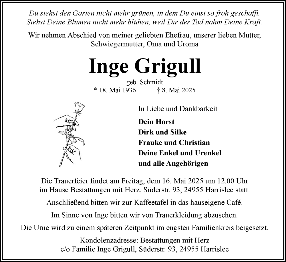 Hier finden Sie alle Traueranzeigen aus der Zeitung, die bisher für Inge Grigull erschienen sind. Weitere Traueranzeigen, die in der Zeitung erscheinen, werden hier ebenfalls aufgelistet