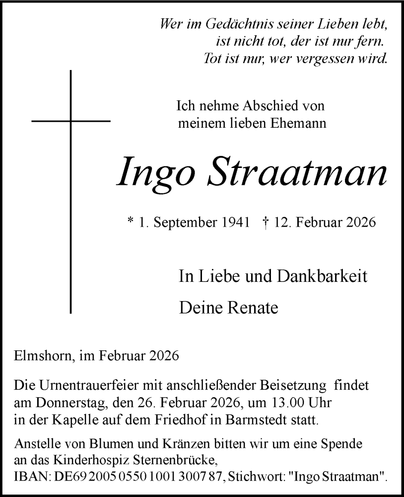 Hier finden Sie alle Traueranzeigen aus der Zeitung, die bisher für Ingo Straatman erschienen sind. Weitere Traueranzeigen, die in der Zeitung erscheinen, werden hier ebenfalls aufgelistet