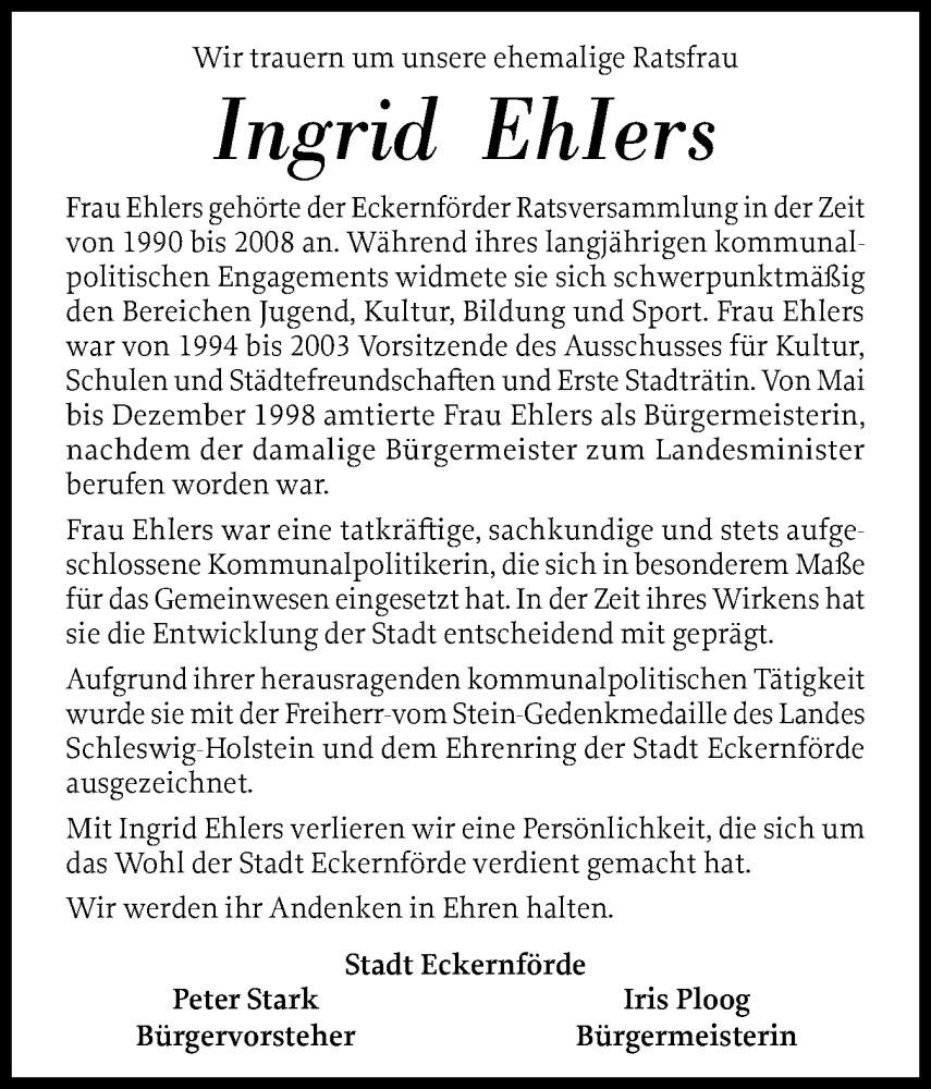 Hier finden Sie alle Traueranzeigen aus der Zeitung, die bisher für Ingrid Ehlers erschienen sind. Weitere Traueranzeigen, die in der Zeitung erscheinen, werden hier ebenfalls aufgelistet