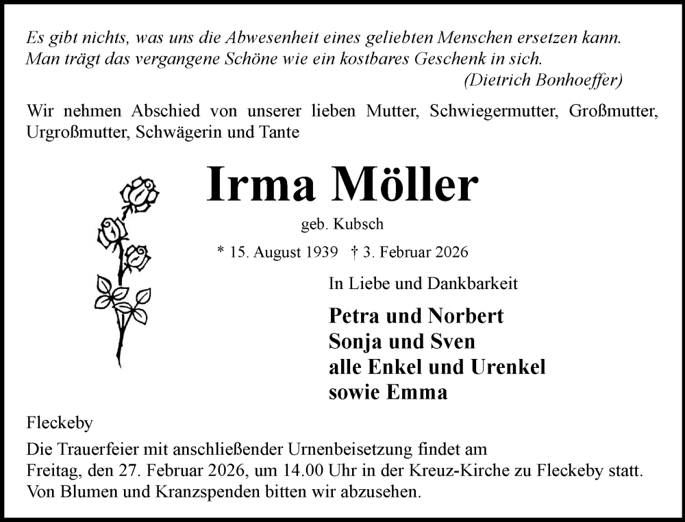 Hier finden Sie alle Traueranzeigen aus der Zeitung, die bisher für Irma Möller erschienen sind. Weitere Traueranzeigen, die in der Zeitung erscheinen, werden hier ebenfalls aufgelistet