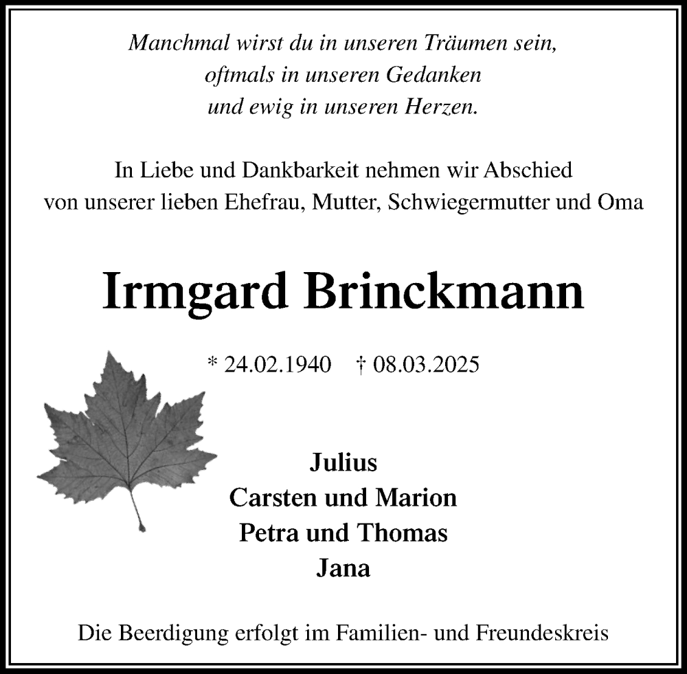 Hier finden Sie alle Traueranzeigen aus der Zeitung, die bisher für Irmgard Brinckmann erschienen sind. Weitere Traueranzeigen, die in der Zeitung erscheinen, werden hier ebenfalls aufgelistet