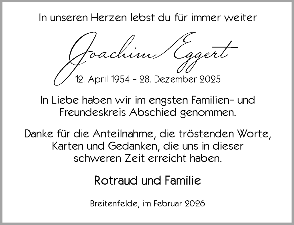 Hier finden Sie alle Traueranzeigen aus der Zeitung, die bisher für Joachim Eggert erschienen sind. Weitere Traueranzeigen, die in der Zeitung erscheinen, werden hier ebenfalls aufgelistet