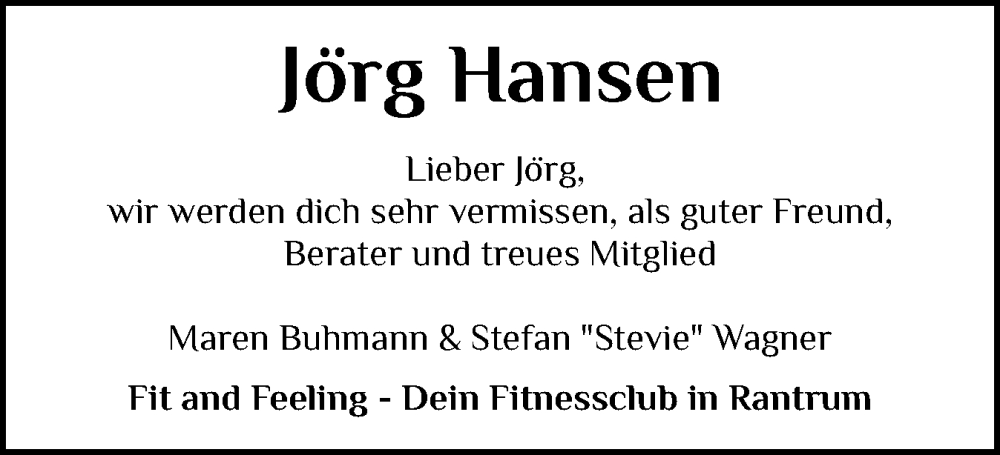 Hier finden Sie alle Traueranzeigen aus der Zeitung, die bisher für Jörg Hansen erschienen sind. Weitere Traueranzeigen, die in der Zeitung erscheinen, werden hier ebenfalls aufgelistet