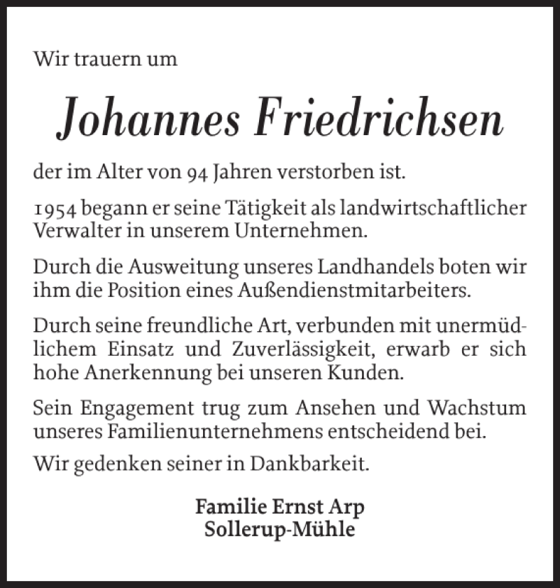 Hier finden Sie alle Traueranzeigen aus der Zeitung, die bisher für Johannes Friedrichsen erschienen sind. Weitere Traueranzeigen, die in der Zeitung erscheinen, werden hier ebenfalls aufgelistet