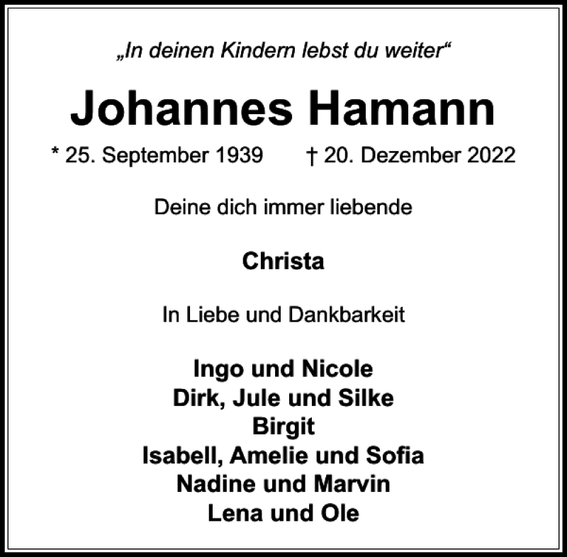 Hier finden Sie alle Traueranzeigen aus der Zeitung, die bisher für Johannes Hamann erschienen sind. Weitere Traueranzeigen, die in der Zeitung erscheinen, werden hier ebenfalls aufgelistet
