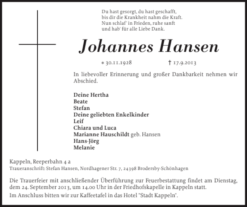 Hier finden Sie alle Traueranzeigen aus der Zeitung, die bisher für Johannes Hansen erschienen sind. Weitere Traueranzeigen, die in der Zeitung erscheinen, werden hier ebenfalls aufgelistet