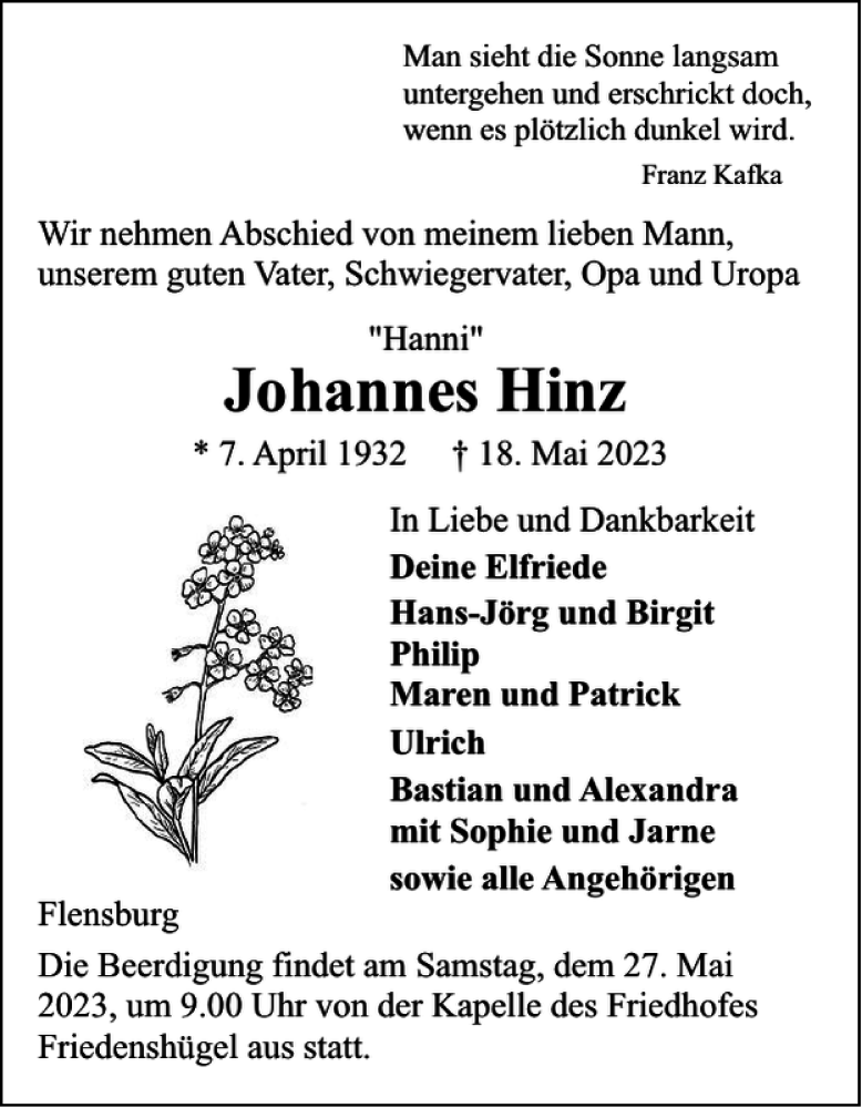 Hier finden Sie alle Traueranzeigen aus der Zeitung, die bisher für Johannes Hinz erschienen sind. Weitere Traueranzeigen, die in der Zeitung erscheinen, werden hier ebenfalls aufgelistet