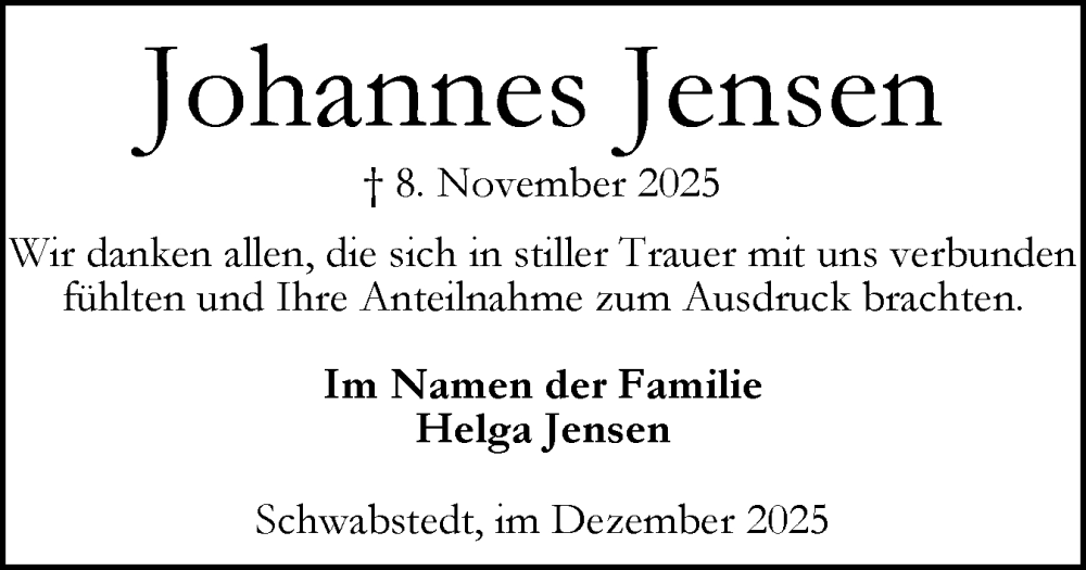 Hier finden Sie alle Traueranzeigen aus der Zeitung, die bisher für Johannes Jensen erschienen sind. Weitere Traueranzeigen, die in der Zeitung erscheinen, werden hier ebenfalls aufgelistet
