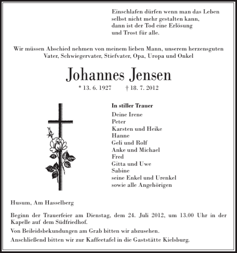 Hier finden Sie alle Traueranzeigen aus der Zeitung, die bisher für Johannes Jensen erschienen sind. Weitere Traueranzeigen, die in der Zeitung erscheinen, werden hier ebenfalls aufgelistet