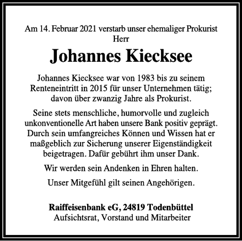 Hier finden Sie alle Traueranzeigen aus der Zeitung, die bisher für Johannes Kiecksee erschienen sind. Weitere Traueranzeigen, die in der Zeitung erscheinen, werden hier ebenfalls aufgelistet