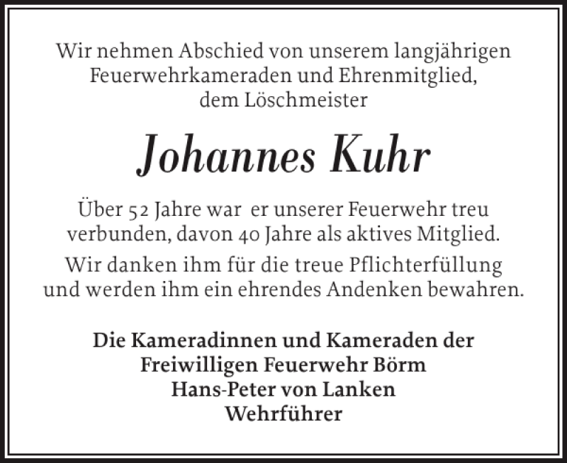 Hier finden Sie alle Traueranzeigen aus der Zeitung, die bisher für Johannes Kuhr erschienen sind. Weitere Traueranzeigen, die in der Zeitung erscheinen, werden hier ebenfalls aufgelistet