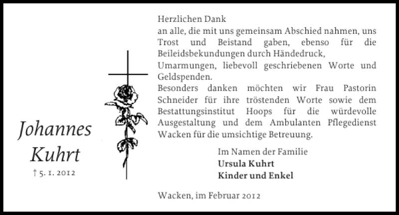 Hier finden Sie alle Traueranzeigen aus der Zeitung, die bisher für Johannes Kuhrt erschienen sind. Weitere Traueranzeigen, die in der Zeitung erscheinen, werden hier ebenfalls aufgelistet