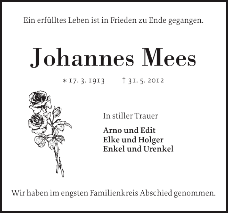 Hier finden Sie alle Traueranzeigen aus der Zeitung, die bisher für Johannes Mees erschienen sind. Weitere Traueranzeigen, die in der Zeitung erscheinen, werden hier ebenfalls aufgelistet