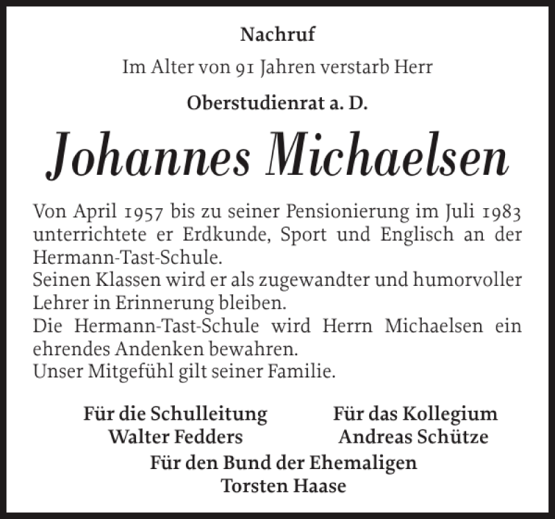 Hier finden Sie alle Traueranzeigen aus der Zeitung, die bisher für Johannes Michaelsen erschienen sind. Weitere Traueranzeigen, die in der Zeitung erscheinen, werden hier ebenfalls aufgelistet