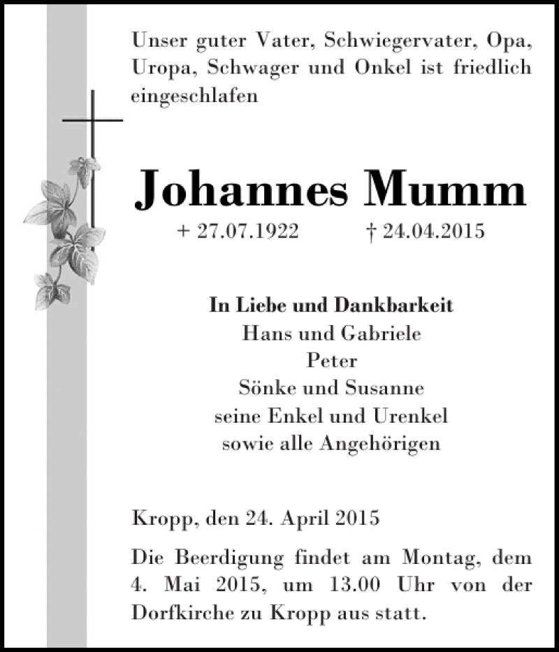 Hier finden Sie alle Traueranzeigen aus der Zeitung, die bisher für Johannes Mumm erschienen sind. Weitere Traueranzeigen, die in der Zeitung erscheinen, werden hier ebenfalls aufgelistet