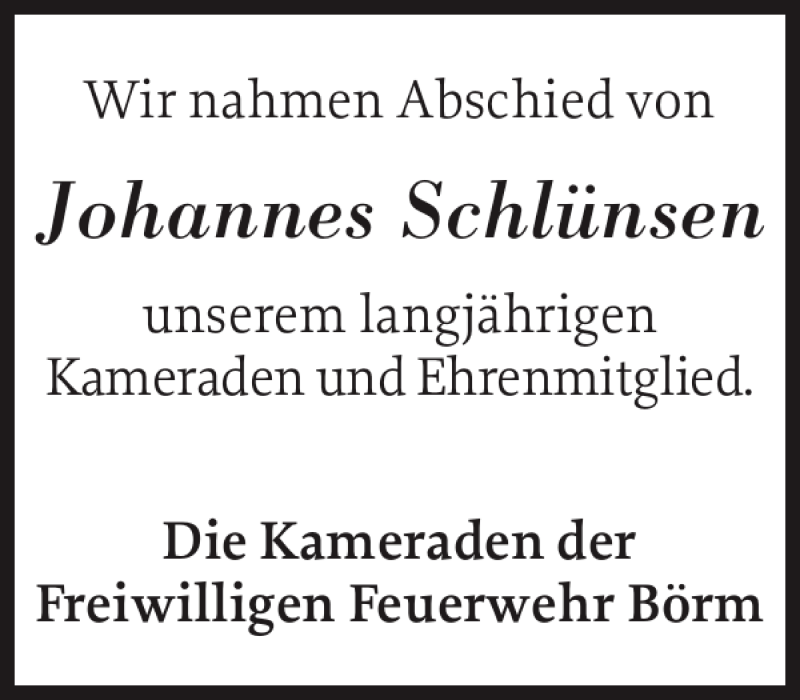 Hier finden Sie alle Traueranzeigen aus der Zeitung, die bisher für Johannes Schlünsen erschienen sind. Weitere Traueranzeigen, die in der Zeitung erscheinen, werden hier ebenfalls aufgelistet