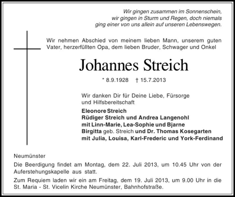 Hier finden Sie alle Traueranzeigen aus der Zeitung, die bisher für Johannes Streich erschienen sind. Weitere Traueranzeigen, die in der Zeitung erscheinen, werden hier ebenfalls aufgelistet
