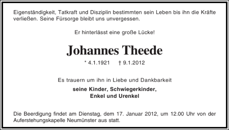 Hier finden Sie alle Traueranzeigen aus der Zeitung, die bisher für Johannes Theede erschienen sind. Weitere Traueranzeigen, die in der Zeitung erscheinen, werden hier ebenfalls aufgelistet