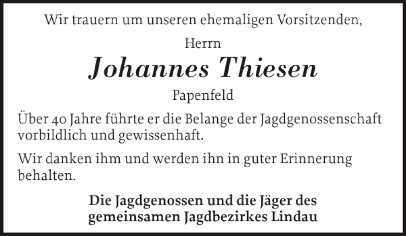 Hier finden Sie alle Traueranzeigen aus der Zeitung, die bisher für Johannes Thiesen erschienen sind. Weitere Traueranzeigen, die in der Zeitung erscheinen, werden hier ebenfalls aufgelistet