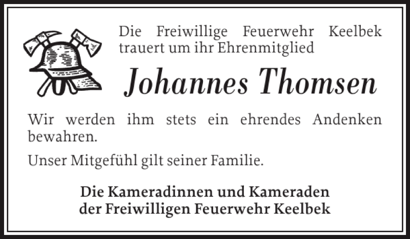 Hier finden Sie alle Traueranzeigen aus der Zeitung, die bisher für Johannes Thomsen erschienen sind. Weitere Traueranzeigen, die in der Zeitung erscheinen, werden hier ebenfalls aufgelistet
